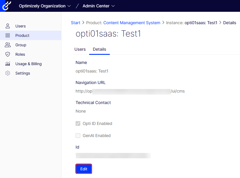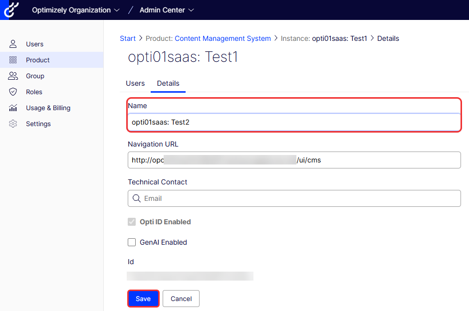 - Enter a new instance Name, which displays in the Opti ID Admin Center (including in group and role names) and the global navigation bar.