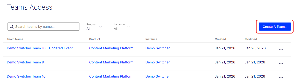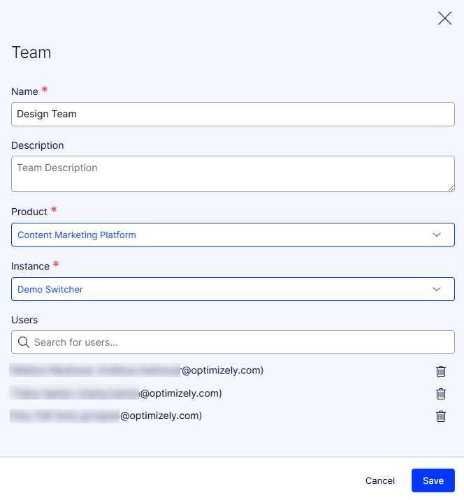 You cannot edit the Product or Instance after you create a team. To change the Product or Instance, you must delete and create a new team.Users – Search for and select the users you want to add to the team.