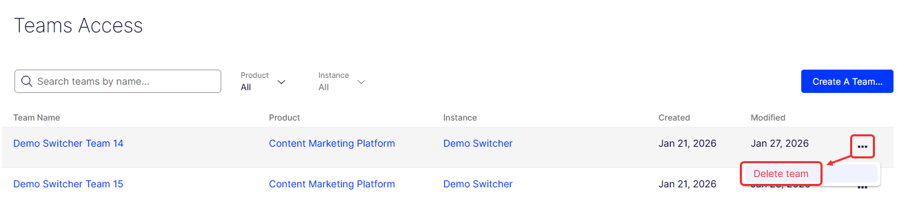 You cannot edit the Product or Instance after you create a team. To change the Product or Instance, you must delete and create a new team.- Click Save.