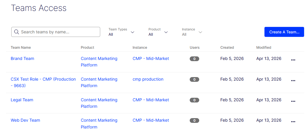 On the Teams Access page, you can search and filter for specific teams, view the product and instance each team is associated with, see the number of users in each team, and see when each team was created and modified.