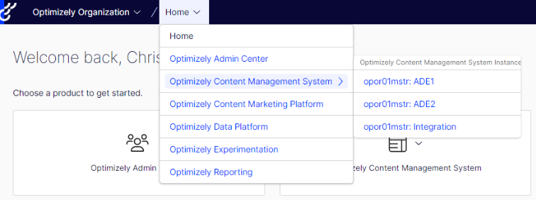The application switcher in the global navigation bar mirrors the entitlements displayed on your dashboard, letting you navigate between your Optimizely applications from the tiles on the home dashboard or the product switcher in the global navigation bar.