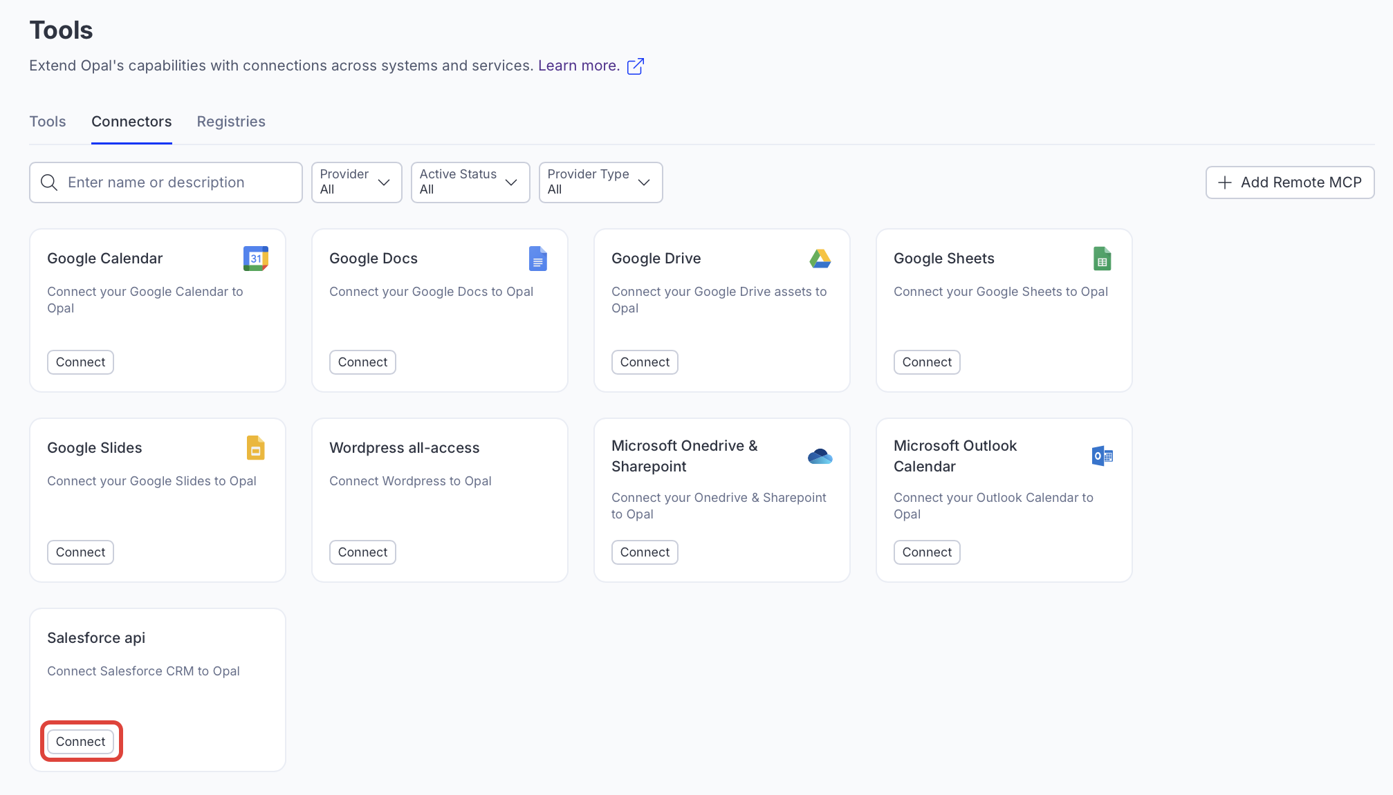 Add the Salesforce CRM tools to your Opal instances