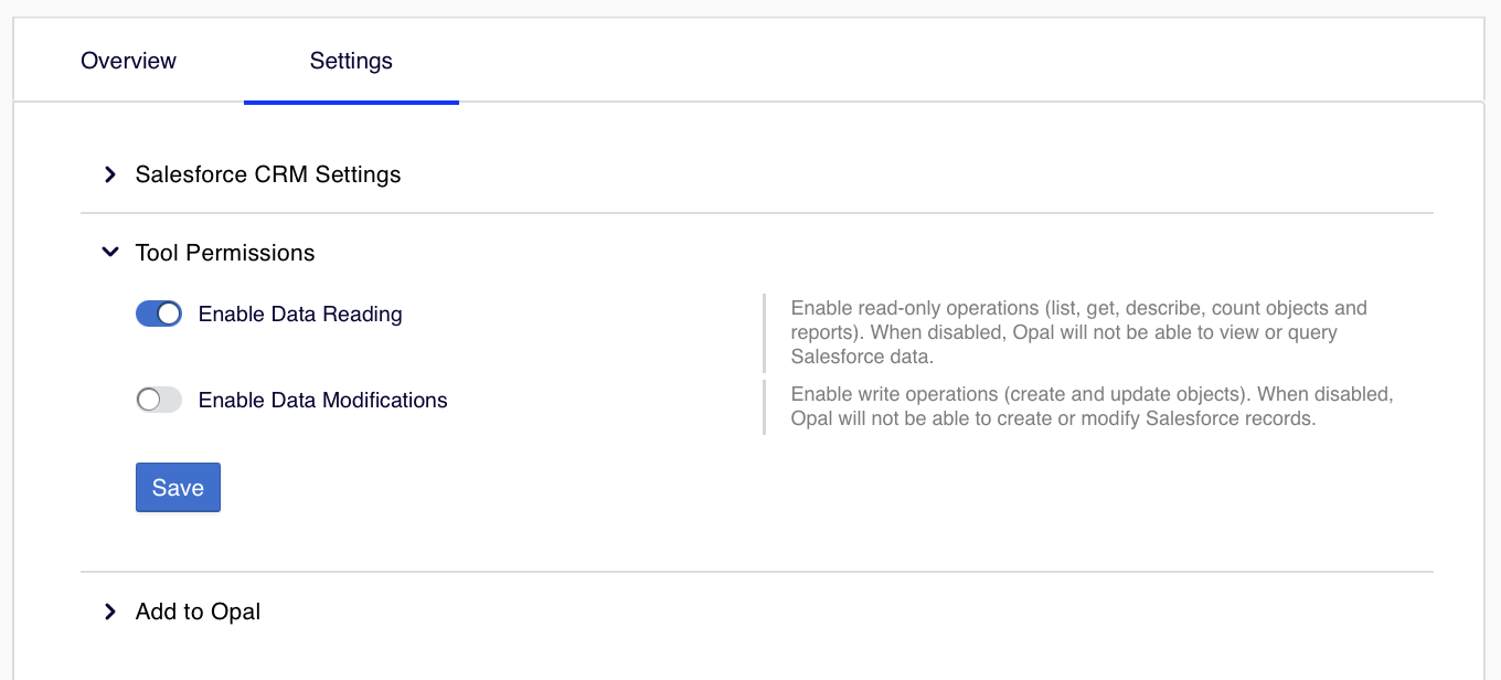 - Enable Data Reading – Tools that let Opal to read data (list, get, describe, count objects, and reports) from Salesforce.