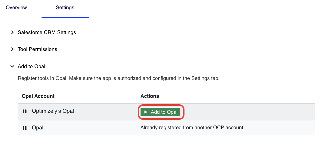 Click Add to Opal to register the Salesforce CRM connector tools to the corresponding Opal instance. Click Remove from Opal to remove the connection.