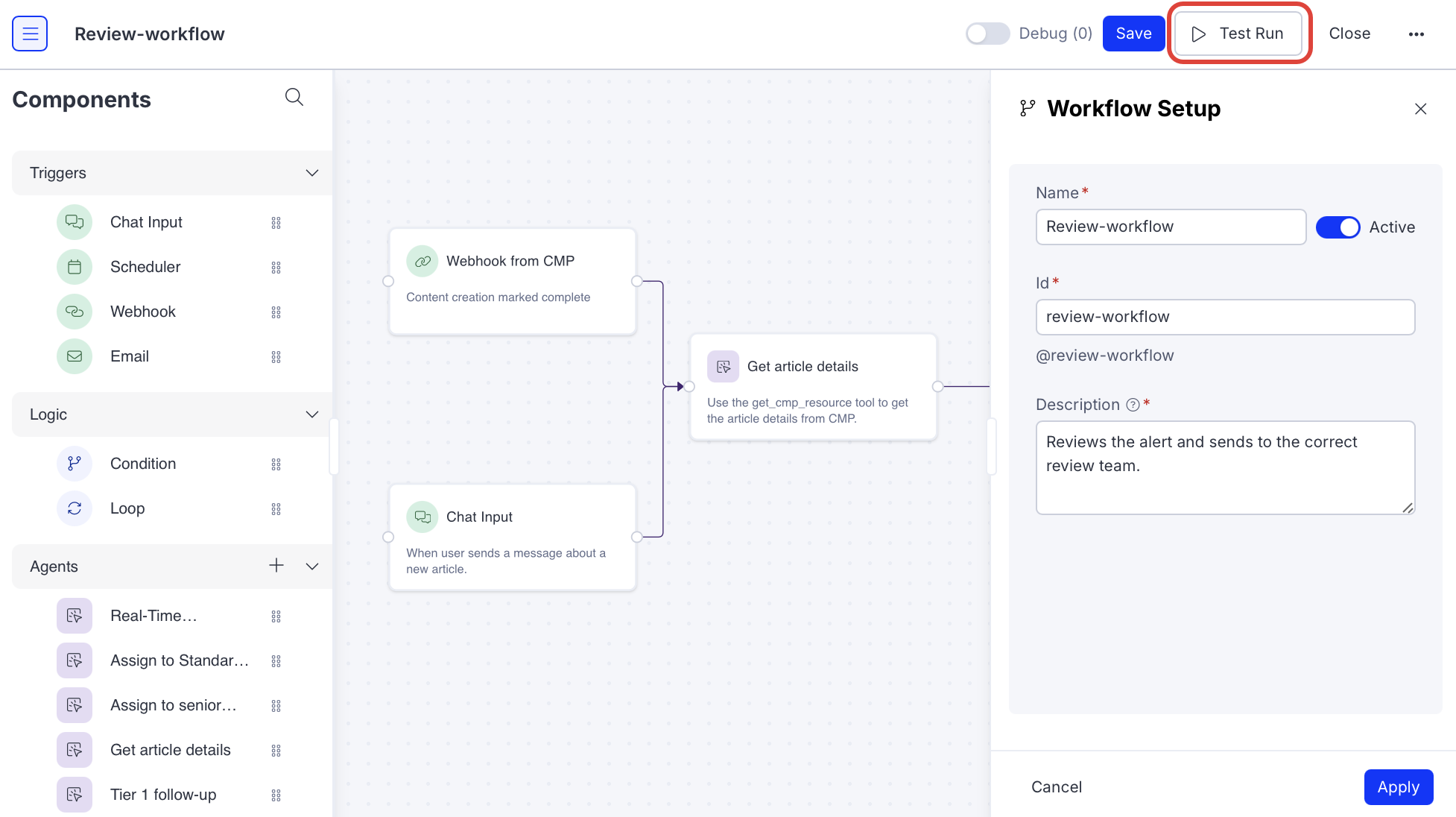 After you create a workflow agent in Optimizely Opal, if you used Chat Input as the trigger, you can test it before deploying it.