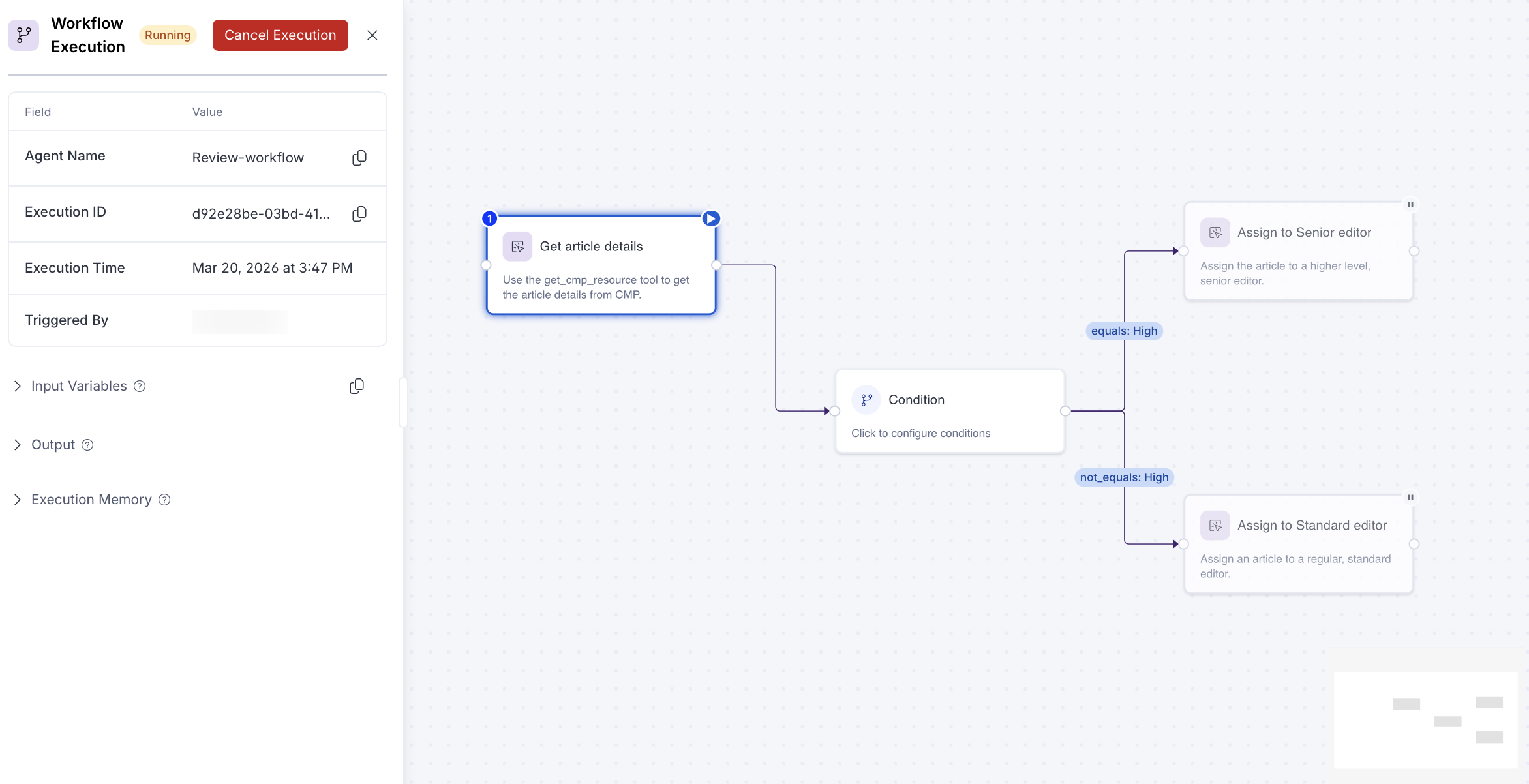 The Workflow Execution displays the workflow agent's progress and status during execution.