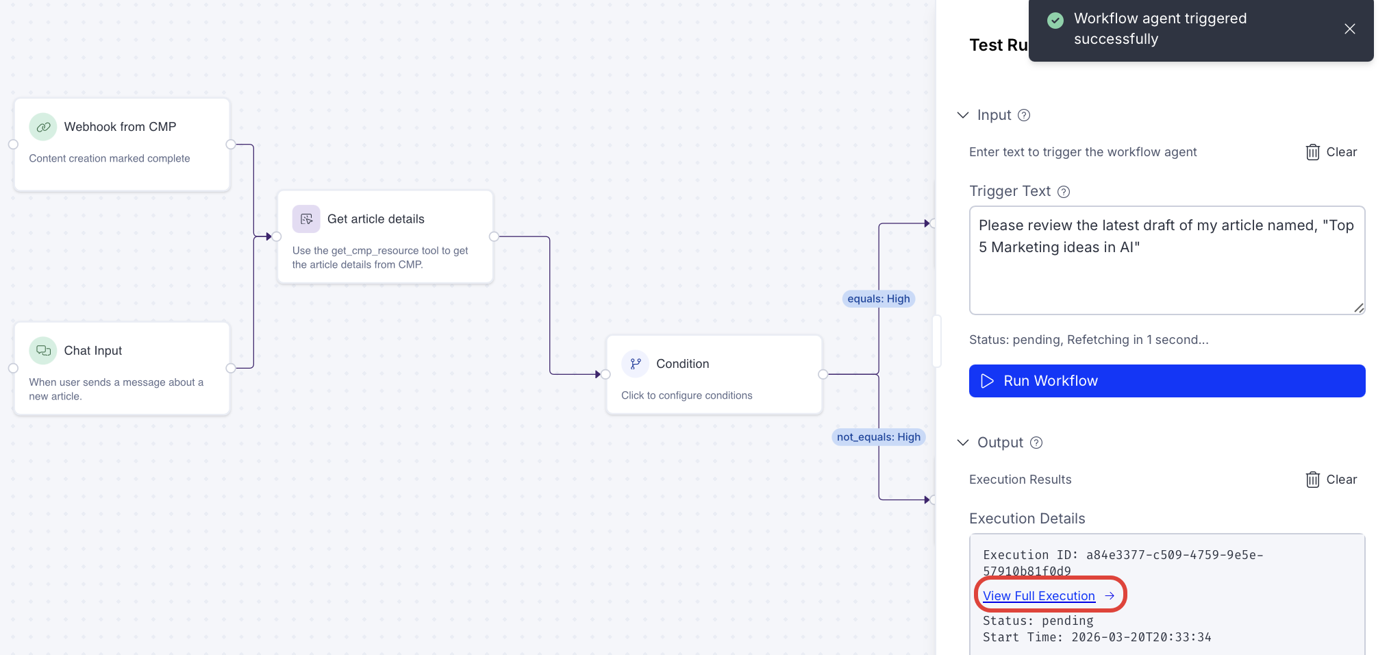 (Optional) Click View Full Execution in the Test Run to open the Workflow Execution.
