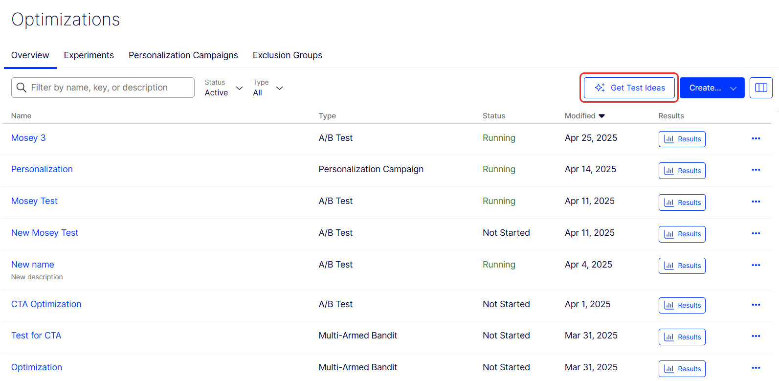 - Go to the Experiments or Optimizations dashboard.