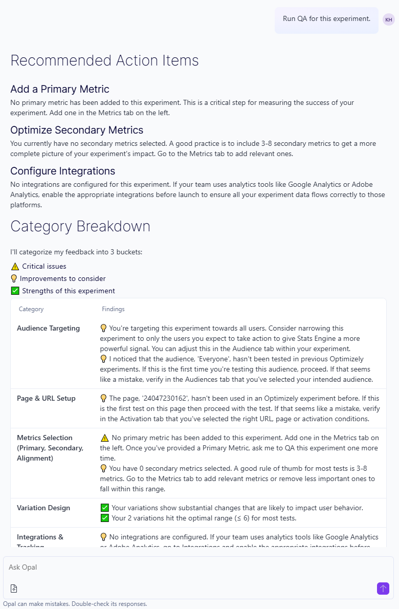 For example, as shown in the following image, Opal may find that you are missing metrics or need to pick better metrics. Opal also provides a breakdown of feedback by category: critical issues, improvements to consider, and strengths of your experiment.
