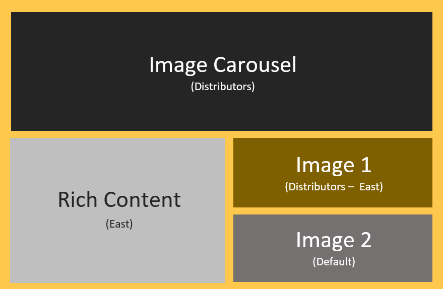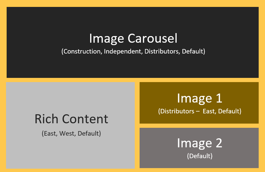 Genevieve designs the Image Carousel widget to display a different image for each of the Construction, Independent, and Distributors customer segments. Should a user not fit into one of those segments, they see the Default content. In the Rich Content widget, Genevieve adds contact for each division's district sales office: either Stamford, Connecticut (East) or Portland, Oregon (West). Should a user not fit into East or West, they see the Default content, which is the general phone number for the corporate office in Stamford. For the Image 1 widget, Laura wants to display information about the upcoming Distributors Expo in Charleston, South Carolina to distributors on the East coast. She creates a seventh customer segment, Distributors East, for these users. Should a user not fit into this segment, they see the Default content, which is a generic product banner. Finally, the Image 2 widget displays information about a current sale on ZMA Machines products; this content is added to the Default customer segment, and applies to all users.