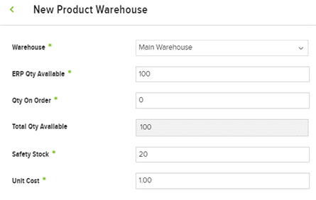 - Assign the appropriate Warehouse, ERP Qty Available, Qty On Order, Safety Stock, and Unit Price to the product.