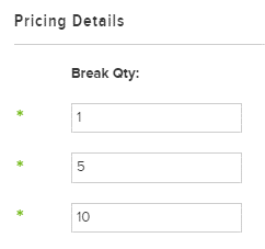 - Modify the quantities in the Break Qty column. The first quantity always is 1. The second break level is the price or percentage to select for the break quantity (such as the second break quantity of 5 equates the first break level to purchases between 1 and 4 items, while the second break level equates to purchases of 5 items or more). Continue this process for each break quantity, up to ten fields.