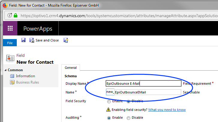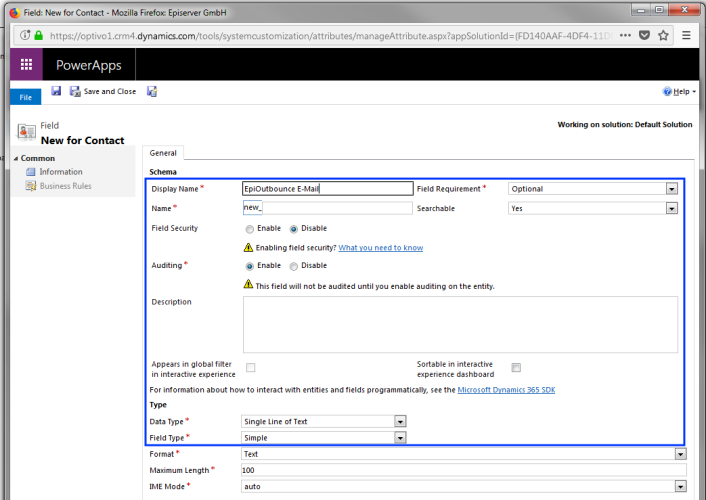 - Name. Click into any other field. The entry is automatically copied to the Name box (without spaces or special characters), with the prefix new_ added. Change the automatically created entry in the Name box, such as changing it to new_epioutbounce eMail. Do not use spaces or special characters. Note the entry in the Name box, you will need this later for the advertising consent.