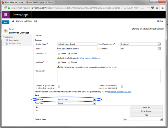 - Data Type. Select Two Options. A field containing the options No and Yes appears.