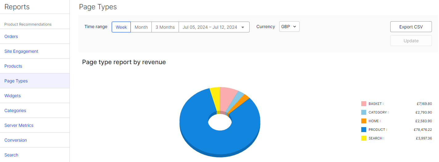 - Page type report by revenue – A pie chart that shows which page types generate the most product recommendation revenue.
