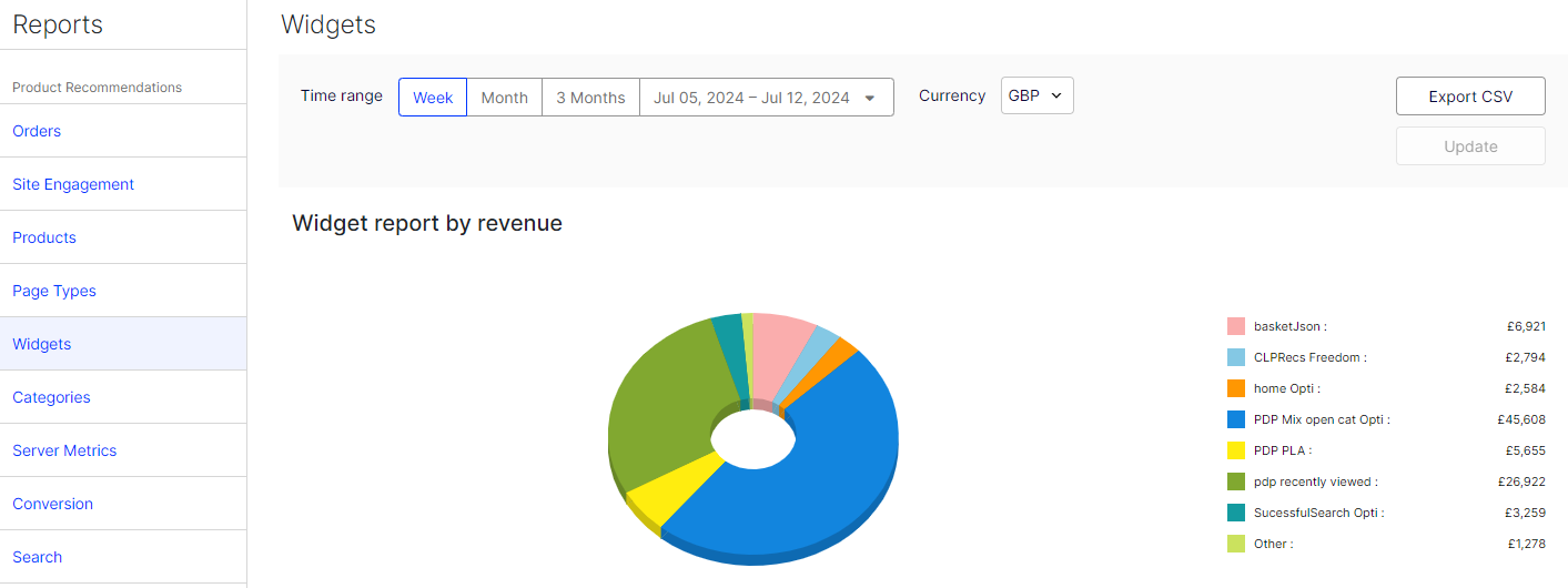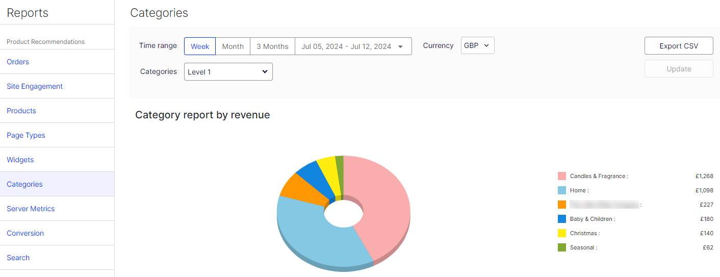 - Category report by revenue – A pie chart that shows which categories generate the most product recommendation revenue. The revenue is not the total revenue for that category, but instead is the revenue from a widget that recommended an item in that specific category. You can filter by different category levels, which are determined by your product catalog.