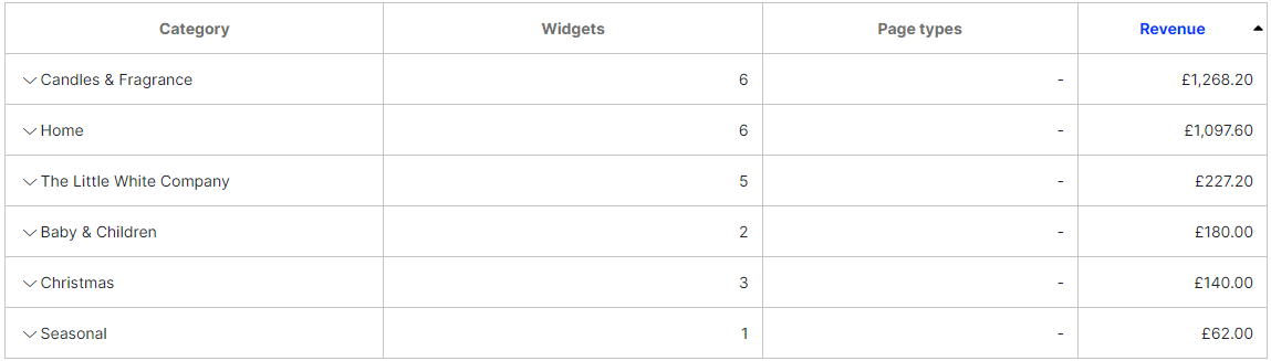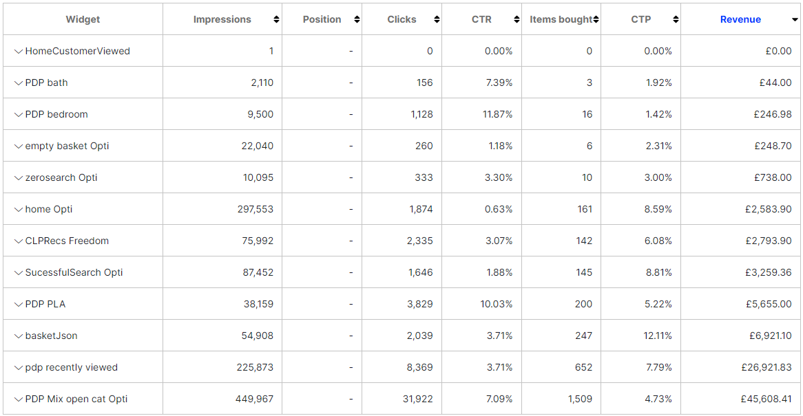 - Widget data table – Shows similar information as the Page Types report, except based on the widget level. Click a widget name to see the individual position performance details within a widget. You can organize the data by the following columns: