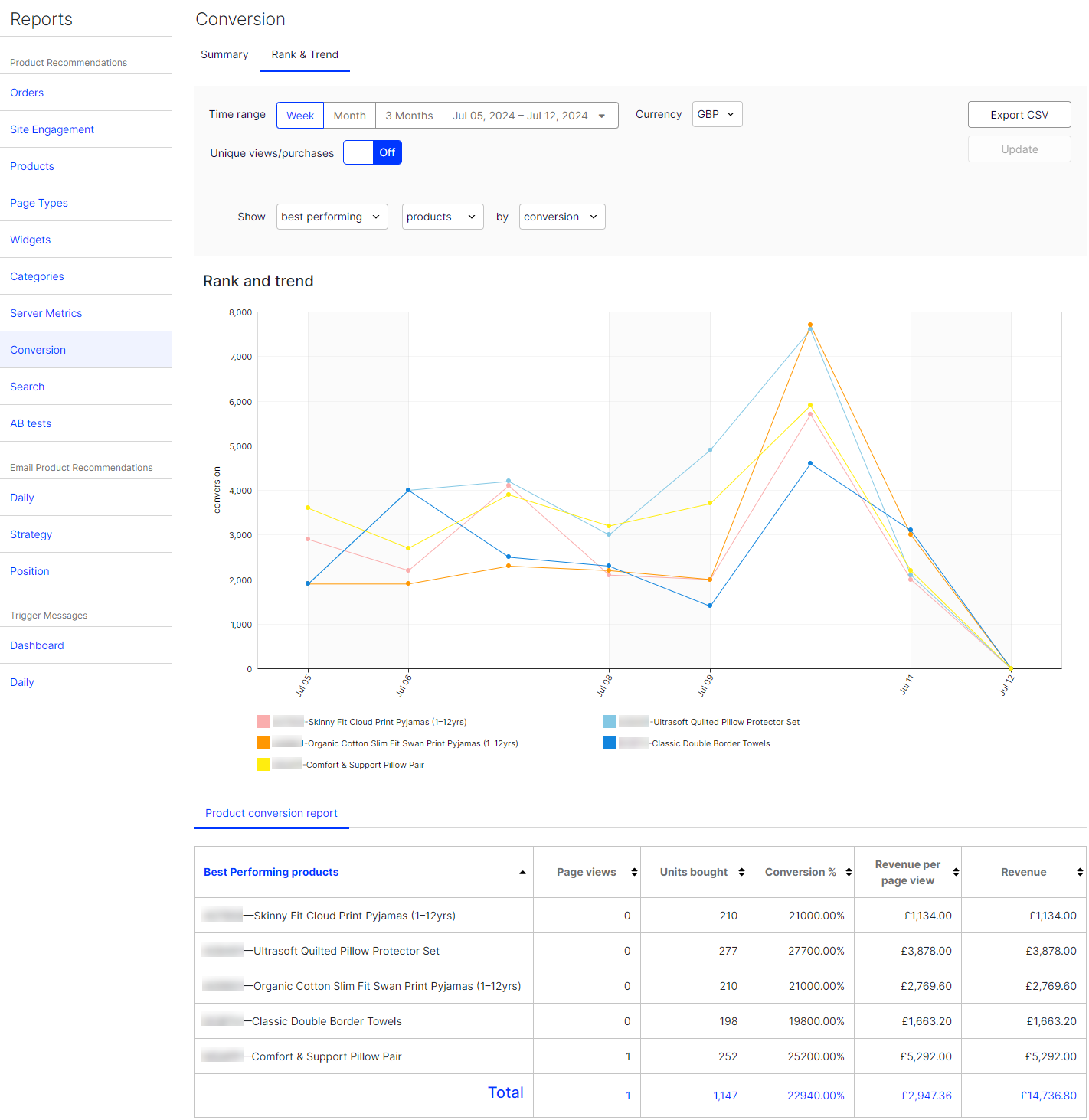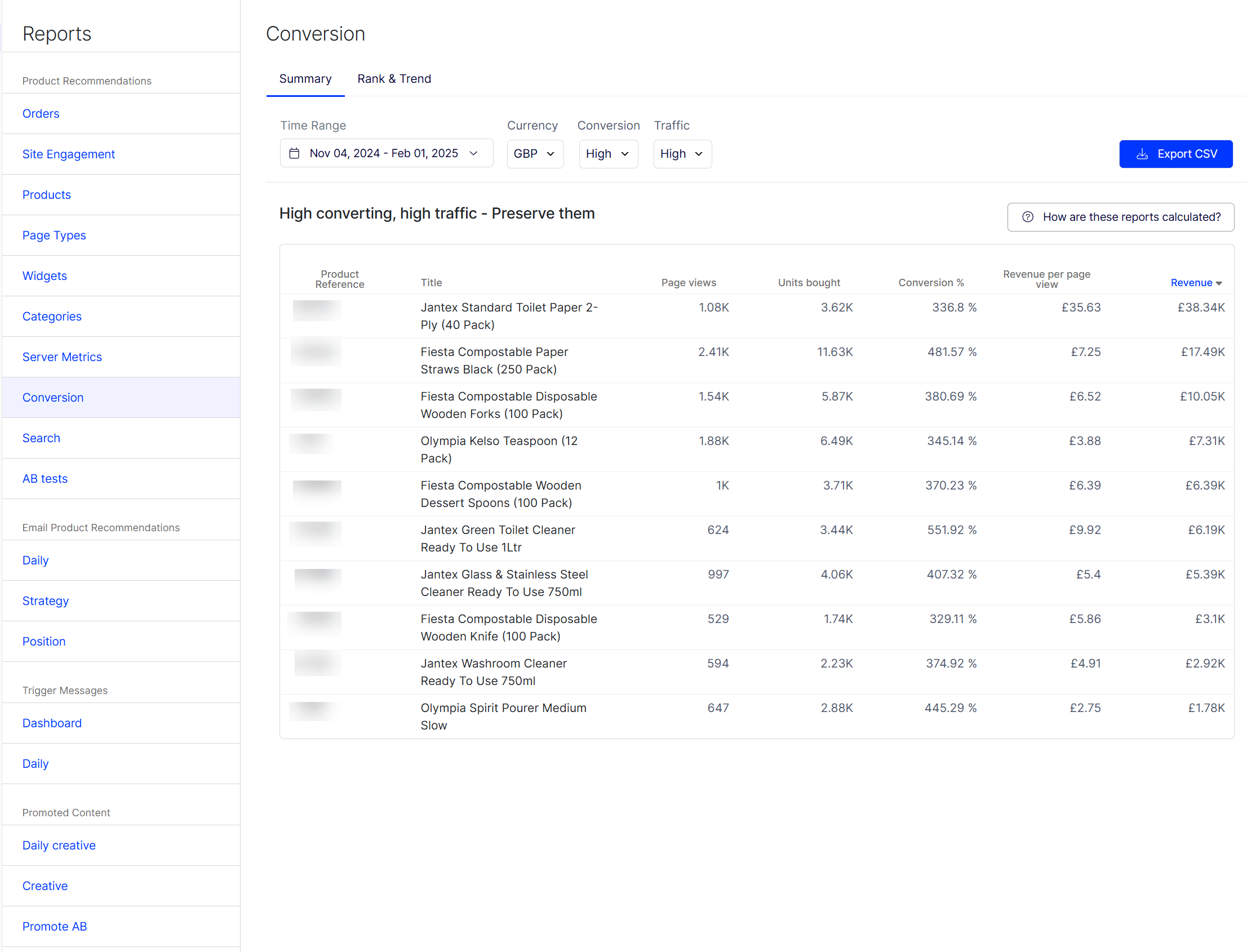 The Conversion report shows the ranking of products based on their overall conversion and page views on a site. It does not focus on product recommendations but can provide accessible, actionable insights based on your whole site, visitors, and orders.