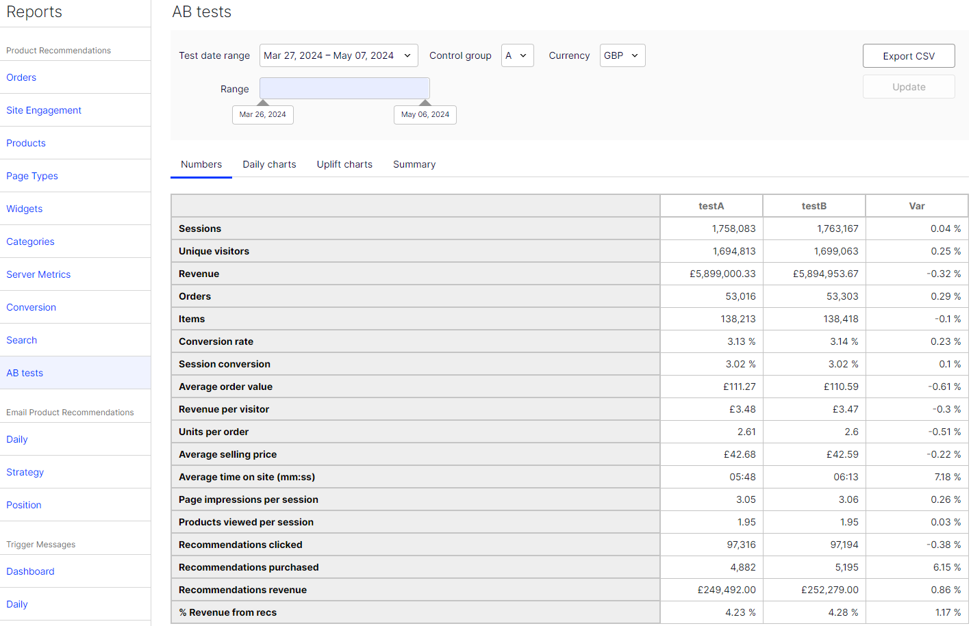 The AB tests report shows the results from the latest Product Recommendations A/B test on a site and past tests.
