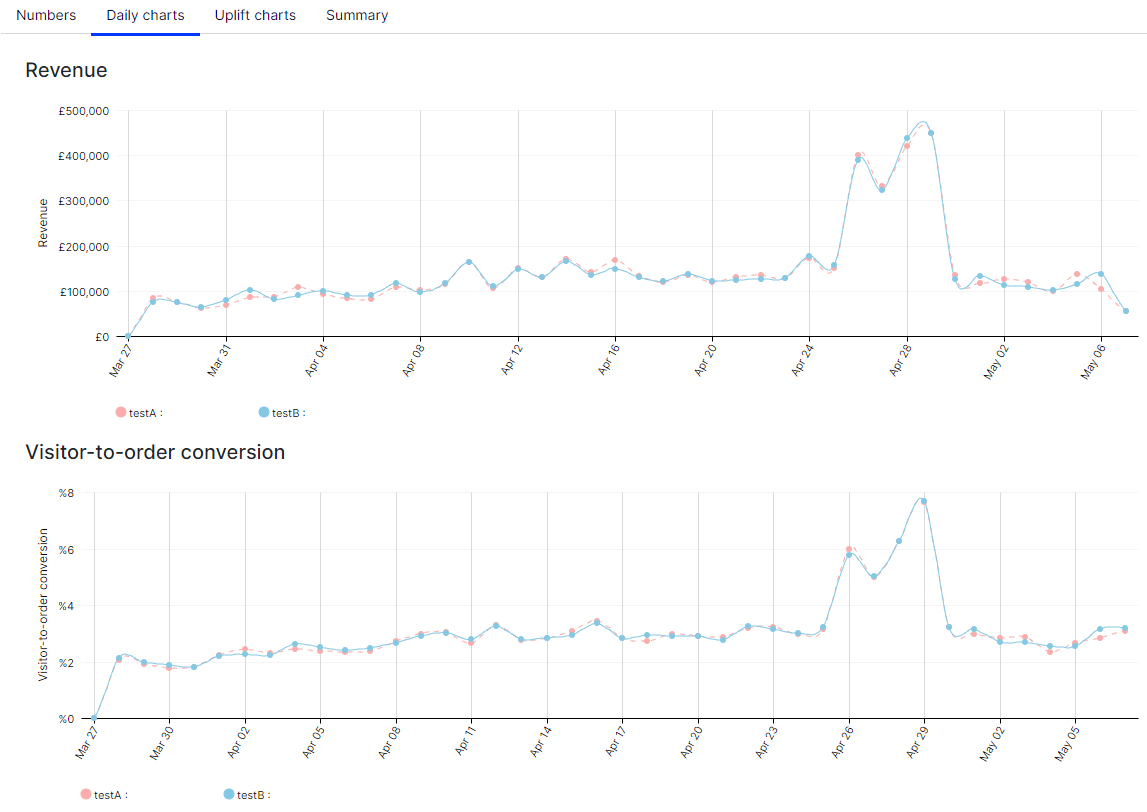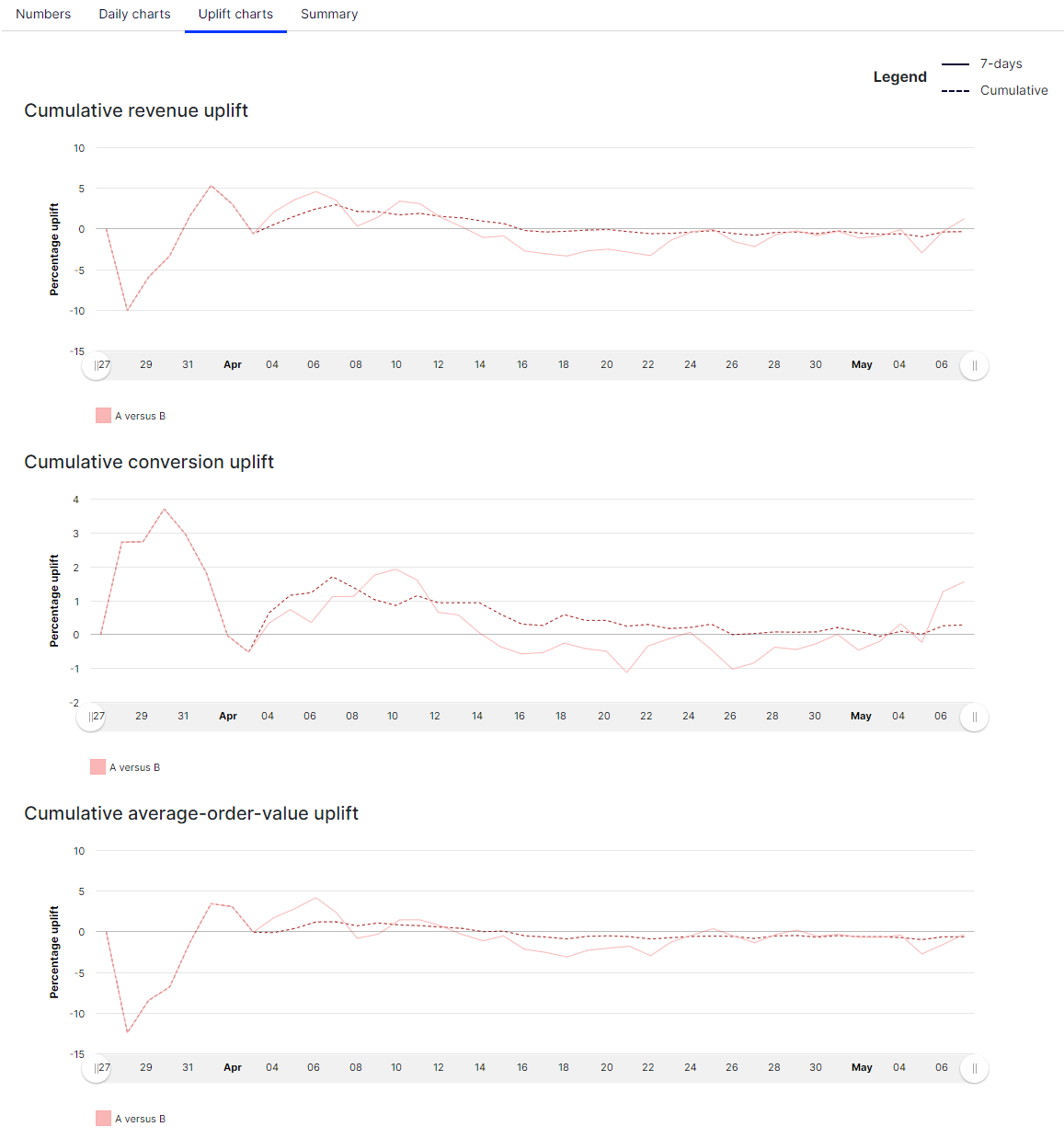 The Uplift charts view shows graphs displaying the revenue, conversion, and average order uplift value for a chosen test group versus the control group for the selected date range (which is cumulative) and over the past 7 days.