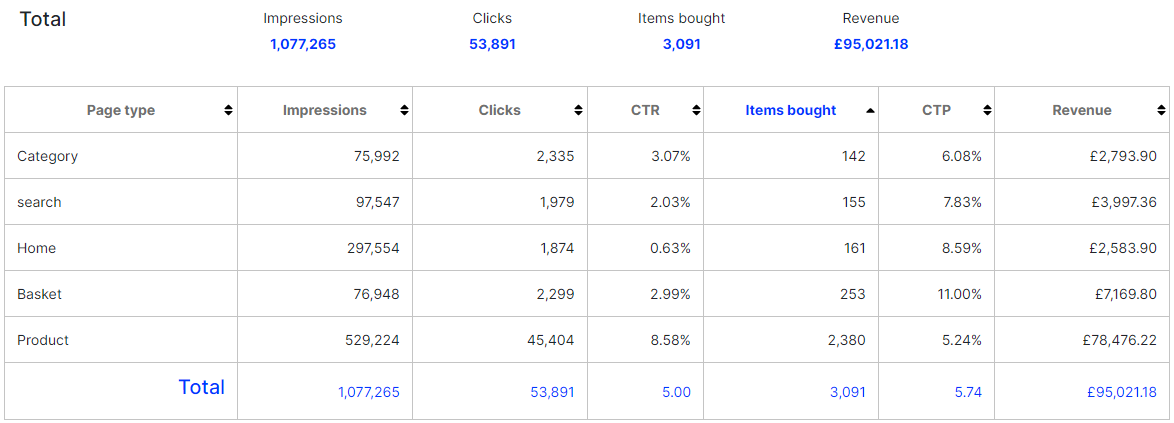 - Items bought shows the number of items purchased through product recommendations on that page type