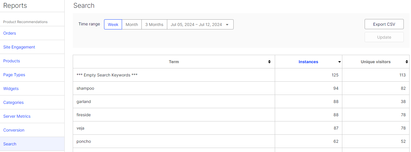 The Site Engagement report displays page impressions, clicks, click-through rate (CTR), and click-to-purchase conversion for product recommendations across your site.