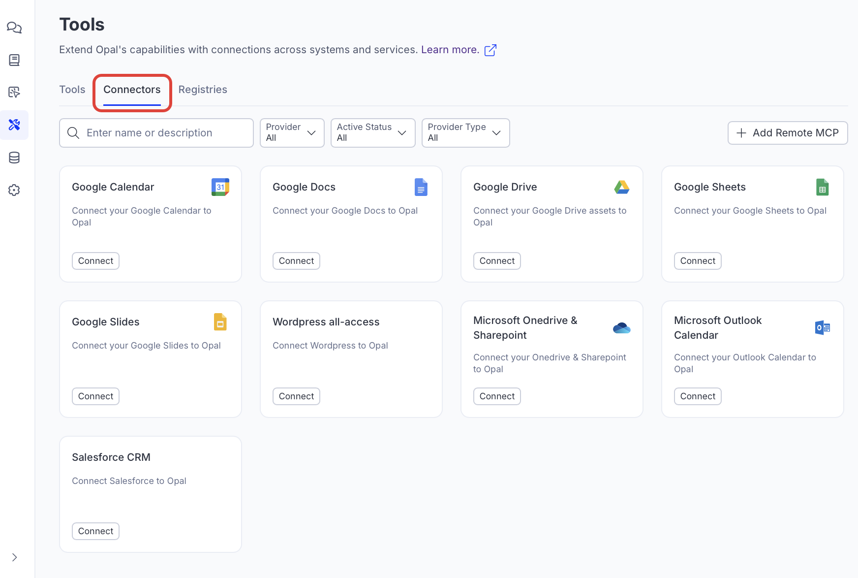 The Connectors tab only displays connectors that an Opal Administrator has enabled for your organization. If a connector you expect to see is not listed, an Opal Administrator has not yet enabled it at the instance level.