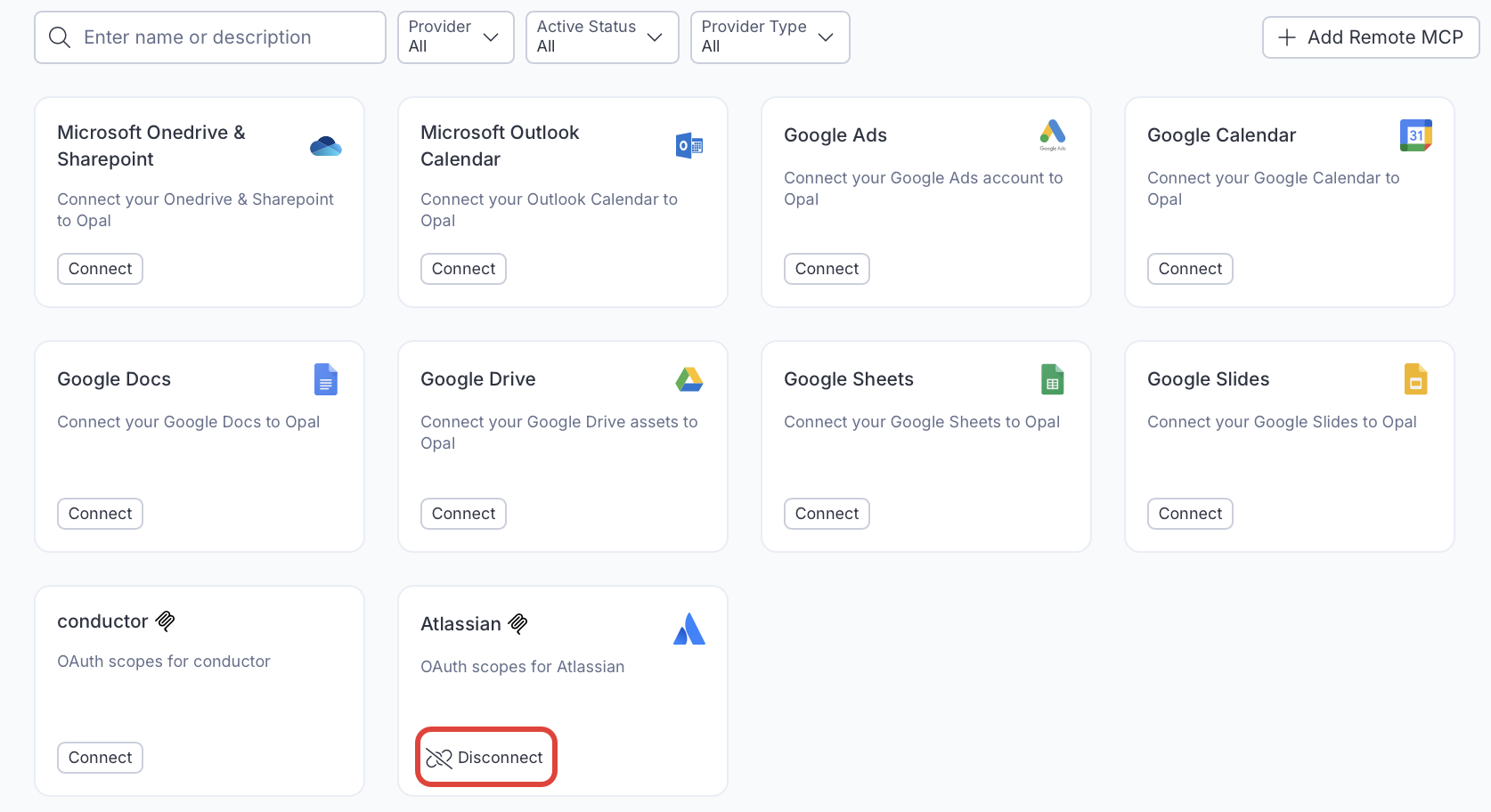 - Have an Opal Administrator enable the connector in OCP or added the remote MCP for your organization.