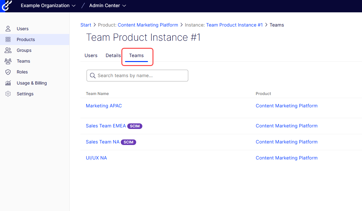 - Go to Products > Content Marketing Platform and select the instance you want to assign to the team.