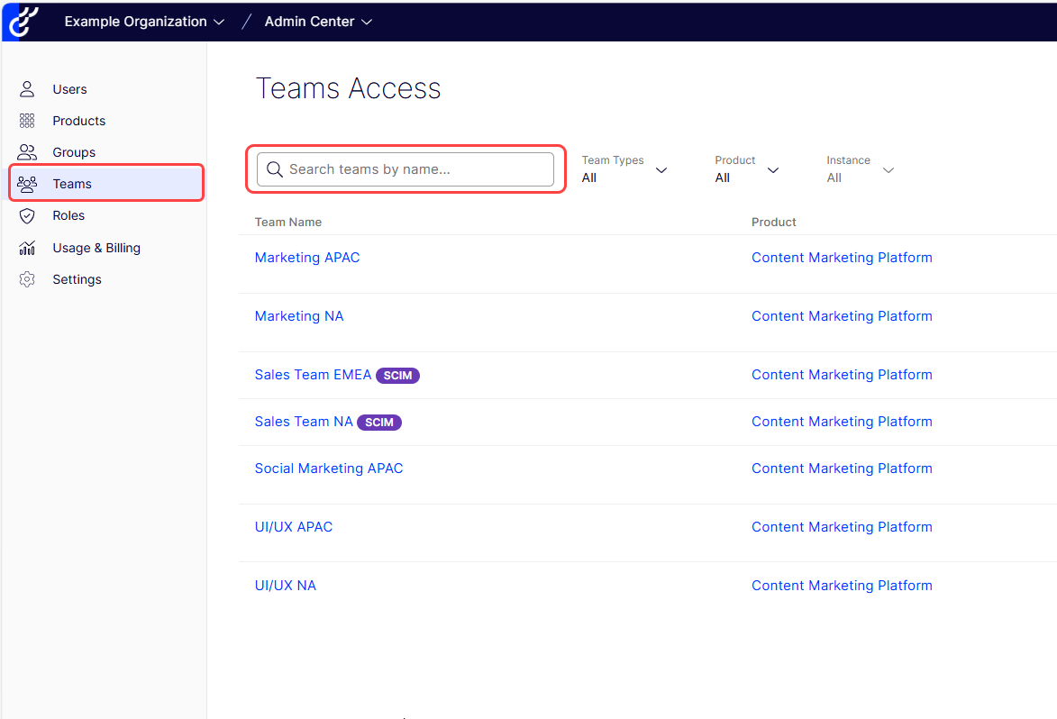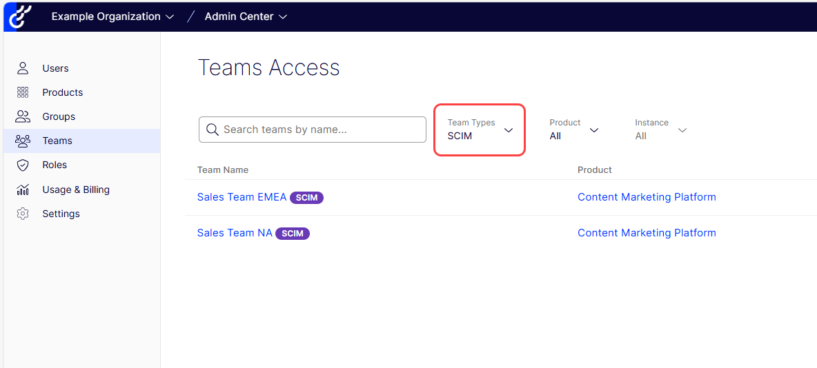 Choose SCIM from the Team Types drop-down list to view SCIM teams only.