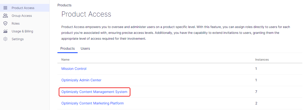 Go to Product Access > Products > Optimizely Content Management System.