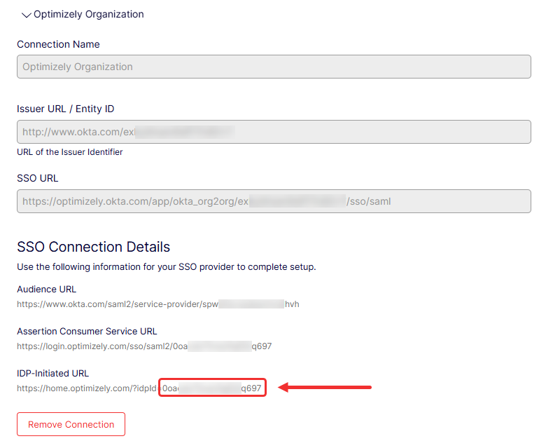 Copy the IdP ID after the equal sign (=) in the IDP-Initiated URL value in the SSO Connection Details section. For example,