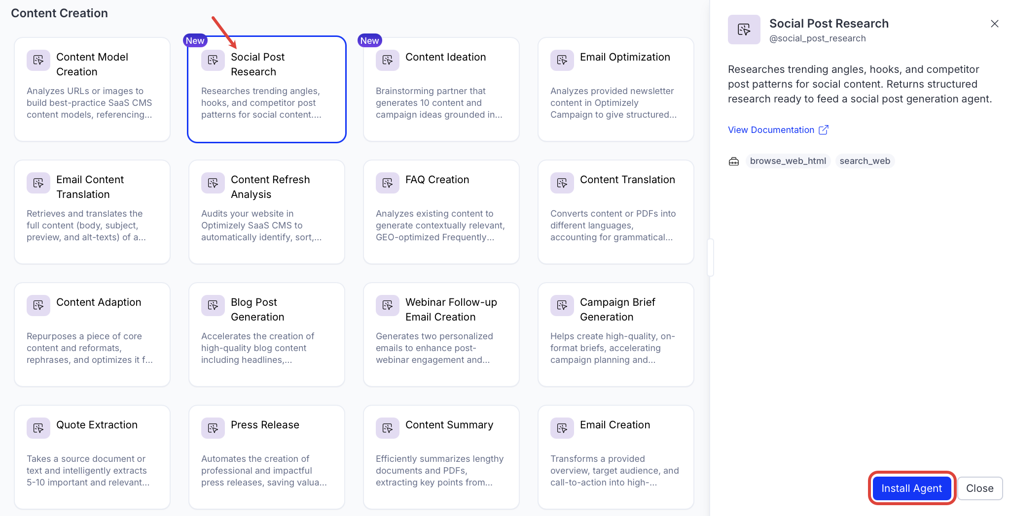 Optimizely Opal's Social Post Research agent researches trending angles, competitive context, and hashtags for any campaign topic, then packages findings into a structured brief ready to hand off for social post creation. Cuts down manual research and ensures every post is grounded in what is resonating in the market right now.
