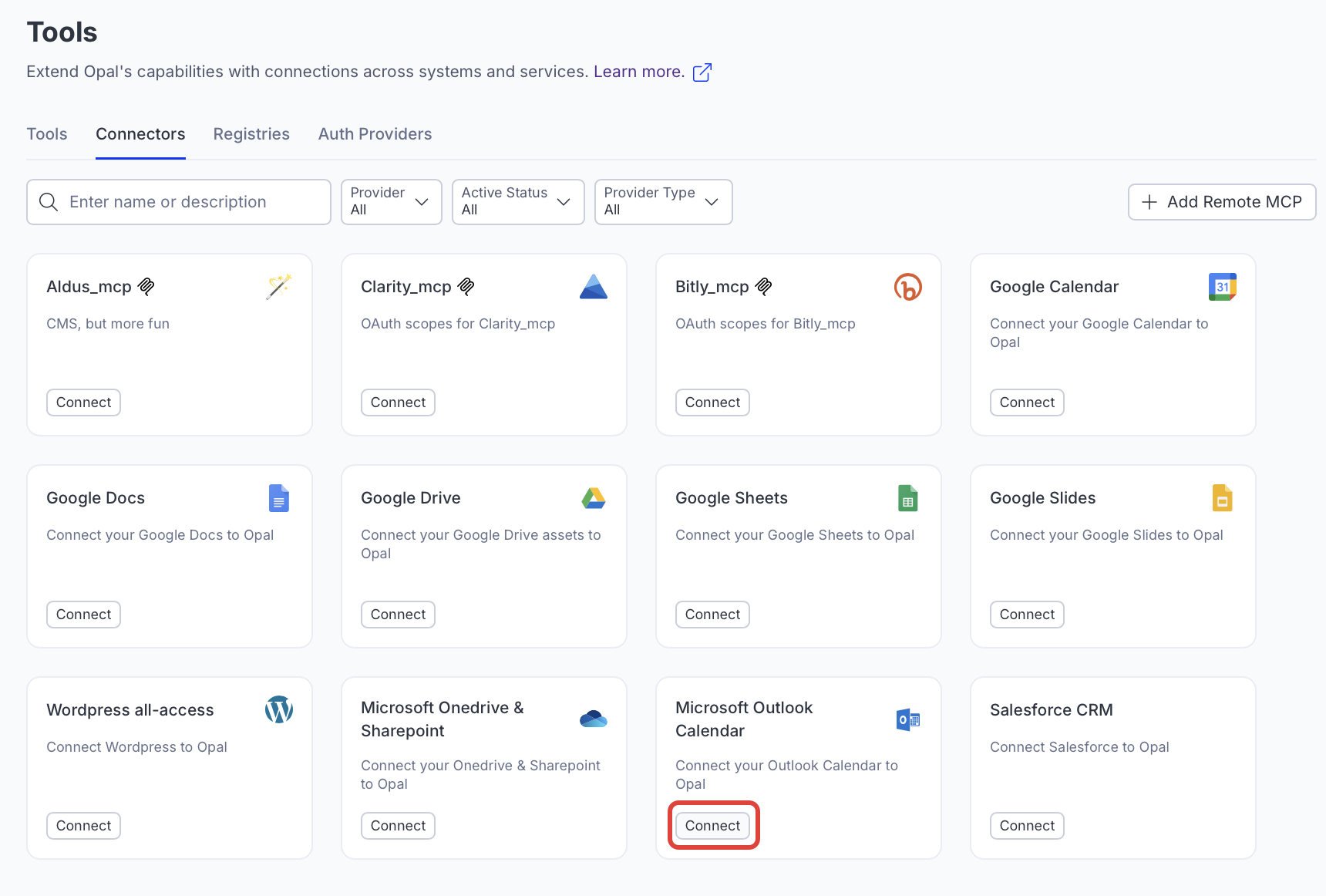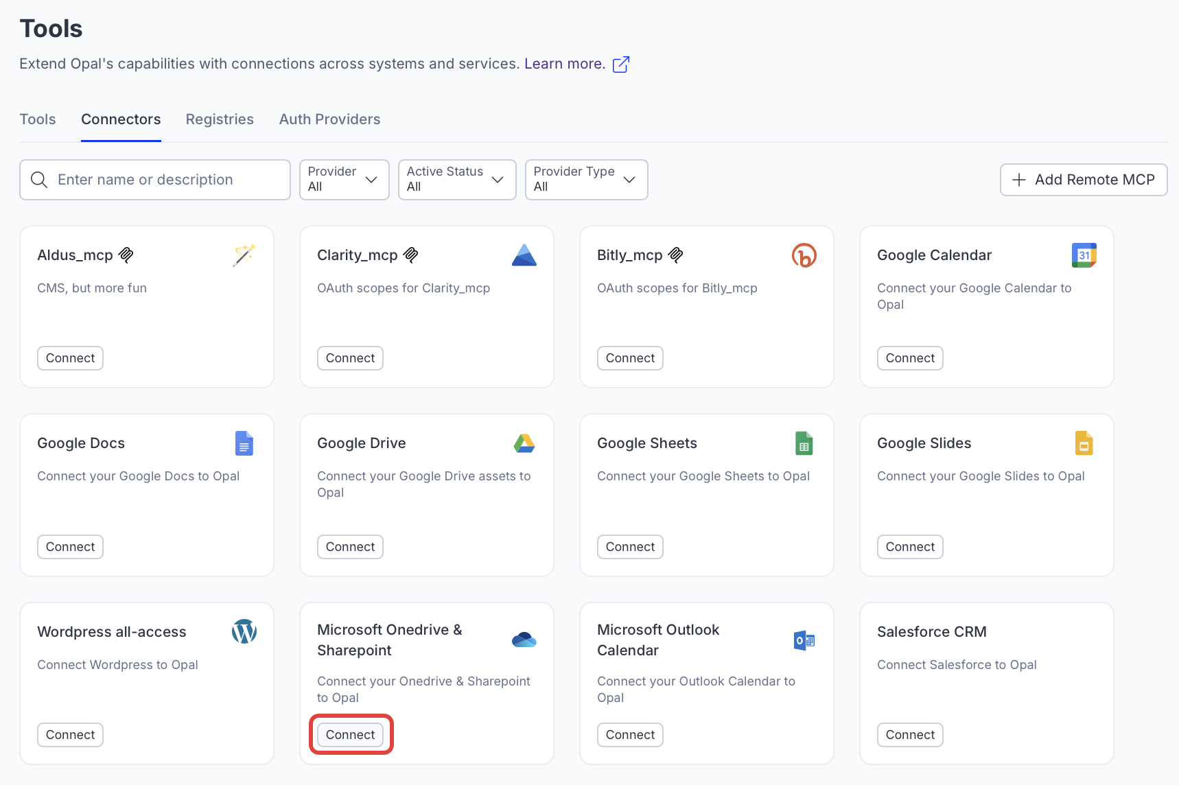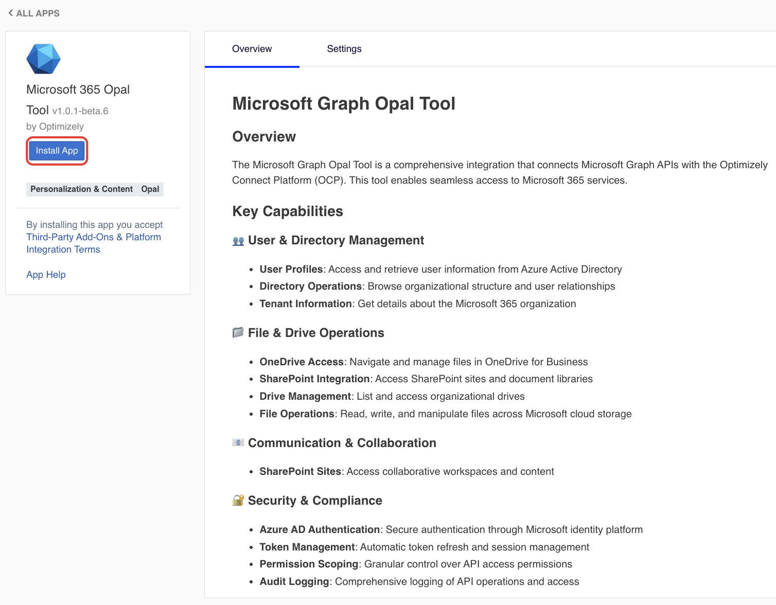 First, an Opal administrator must connect Opal with Microsoft Graph using Optimizely Connect Platform (OCP). Microsoft Graph uses system-level OAuth by default. After installing the connector in OCP and adding the tools to Opal, users and agent builders can optionally log in to Microsoft Sharepoint, OneDrive, and Outlook Calendar to access their personal Microsoft information from within Opal. Administrators only need to install the Microsoft Graph connection in OCP once.