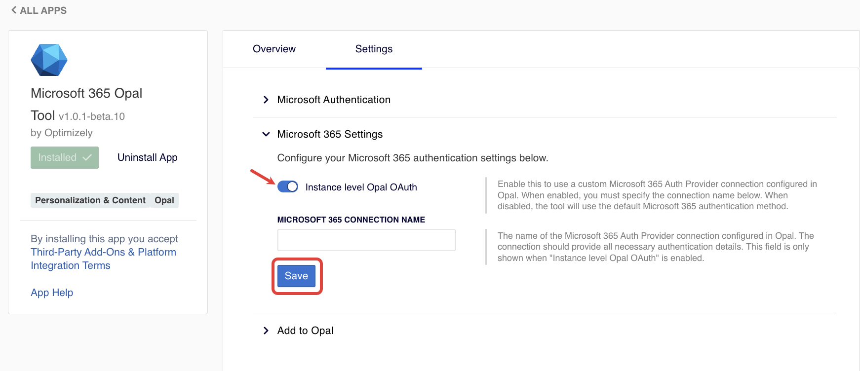 - Toggle Instance level Opal OAuth on and enter your Microsoft 365 Connection Name.