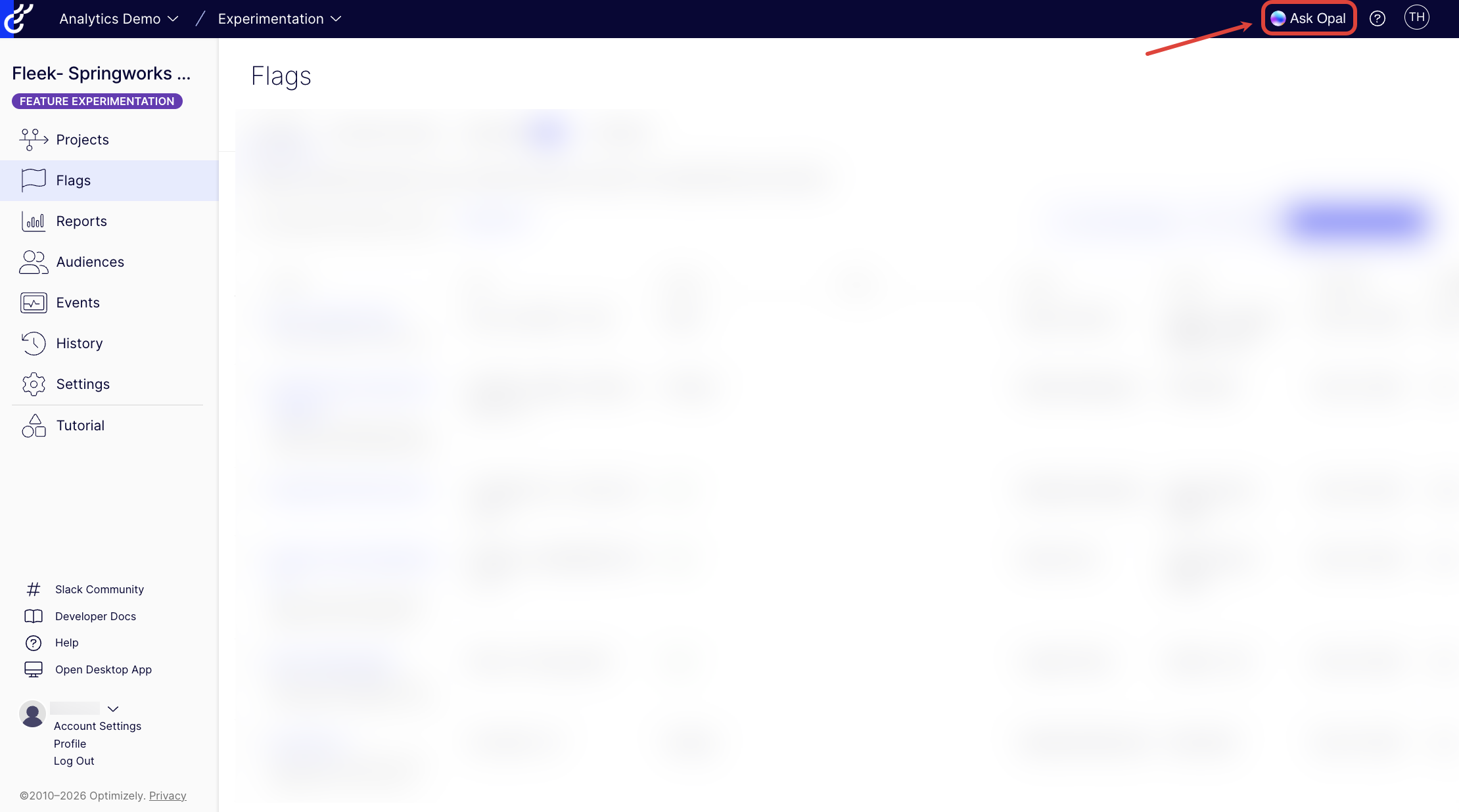 Click Ask Opal from Feature Experimentation to open Opal Chat, which helps you find information, automate tasks, and enhance your product experience. See Optimizely Opal Chat in Feature Experimentation for information.