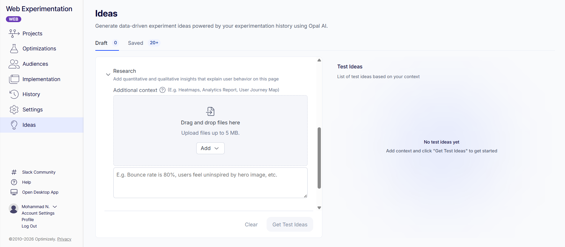 Idea builder works best when you also have additional context ready, such as a heatmap image, qualitative research documents, or notes from your analytics tool. These inputs are optional but improve the quality of generated ideas.